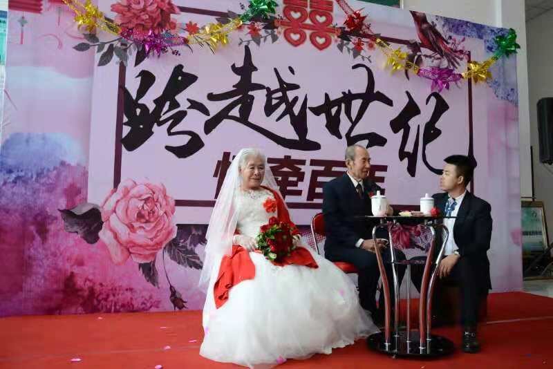 當(dāng)這對(duì)新人慢慢走向舞臺(tái)的時(shí)候,禮花齊放,雖然他們的步伐蹣跚,但感動(dòng)了現(xiàn)場(chǎng)所有的人,大家送上熱烈的掌聲,同時(shí)在場(chǎng)所有人都已經(jīng)落淚。